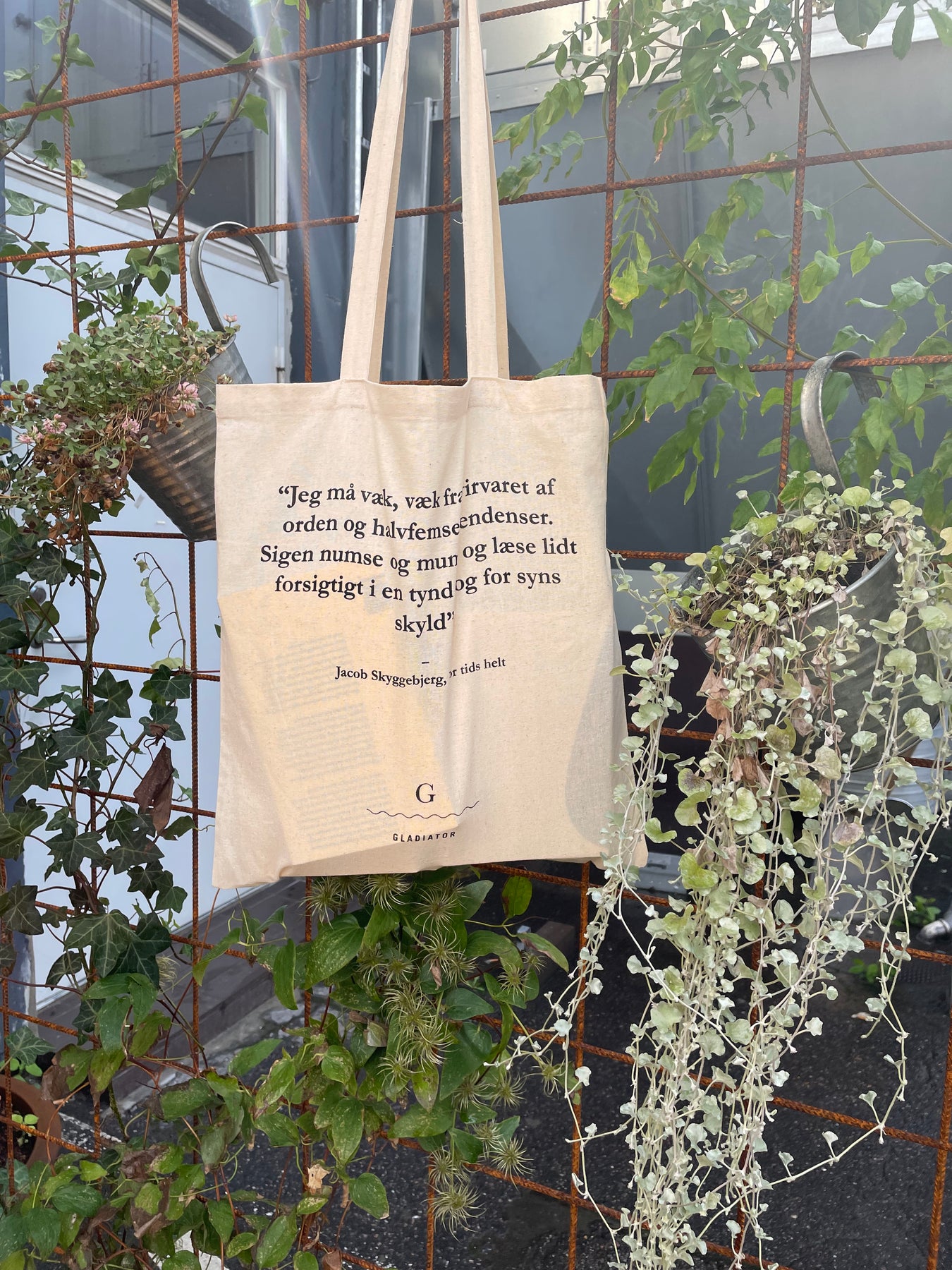 Flot mulepose i 100% bomuld - Oeko-tex standart 100 certificeret - med citat af Jacob Skyggebjerg fra romanen Vor tids helt: